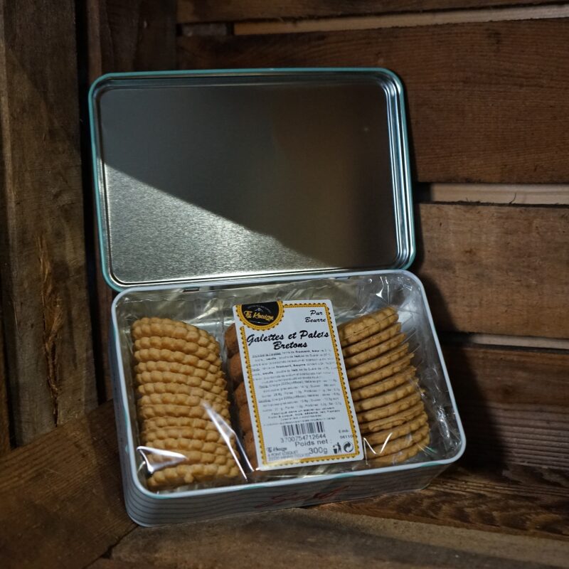 Boite à sucre métallique vendue au choix, vide ou garnie d’un mix de palets et galettes pur beurre.