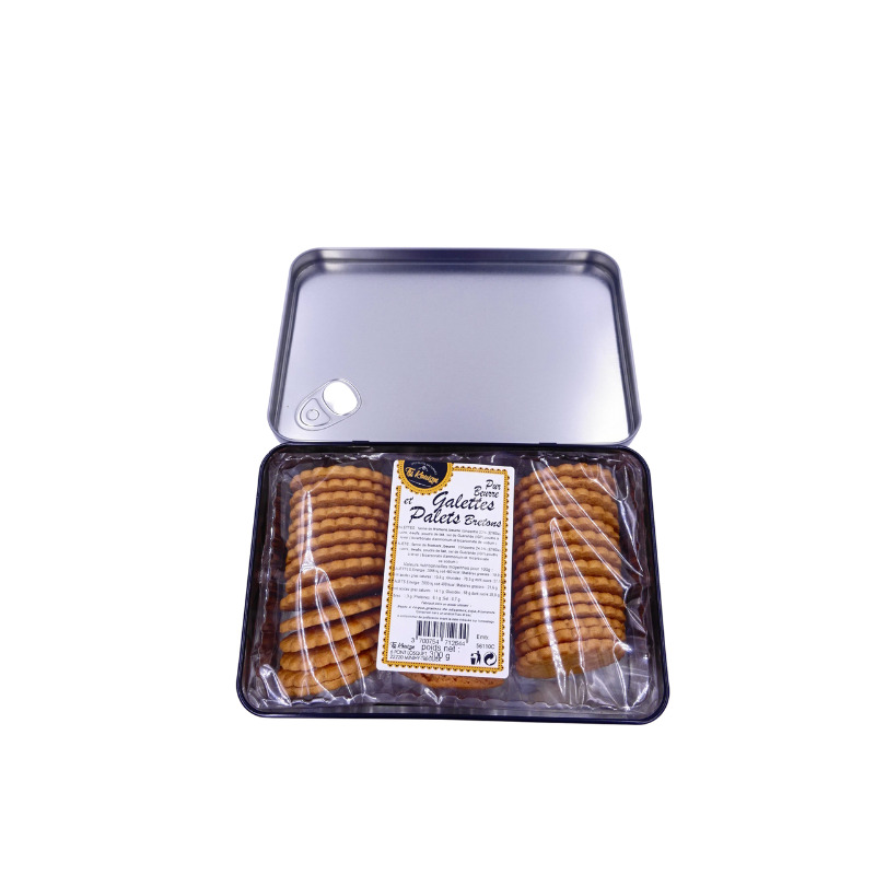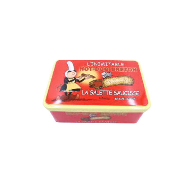 Boite à gâteaux métallique décorée d’un dessin de Nicolaz Le Corre vendue au choix avec un mix de palets et galettes pur beurre ou vide.