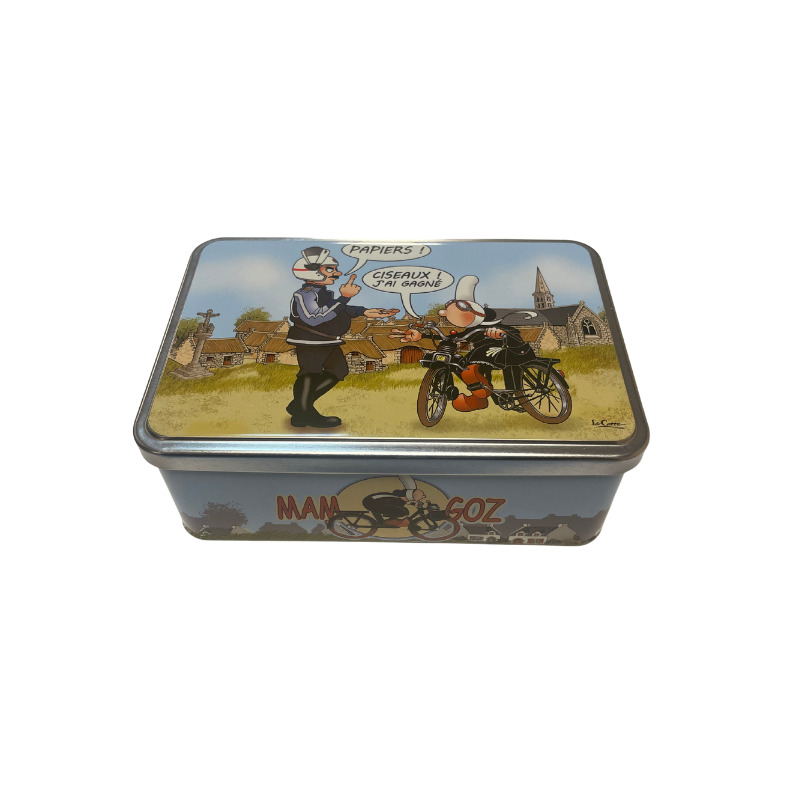 Boite métal à biscuits Mam’Goz dessinée par Nicolaz Le Corre vendue avec un mix de palets et galettes pur beurre ou vide.